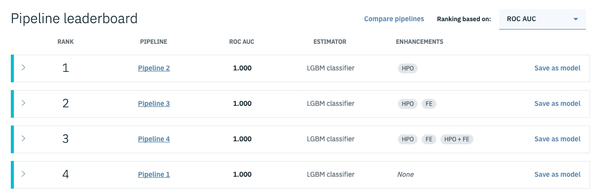 Once the pipeline creation is complete, you can view and compare the ranked pipelines in a leaderboard.